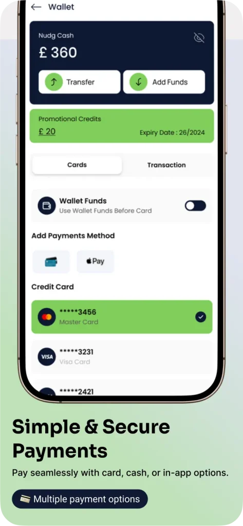 Top up your NUDG wallet, transfer funds, or add a payment method in just a few taps. Whether it's card or in-app payment, it's fast, safe, and always within reach.