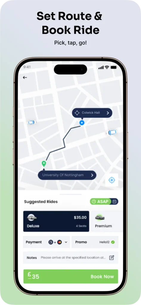 You can book a taxi for immediate or scheduled rides through the app. Simply enter your pickup and drop-off locations, select your preferred payment method, and confirm your booking.